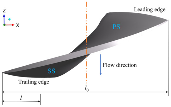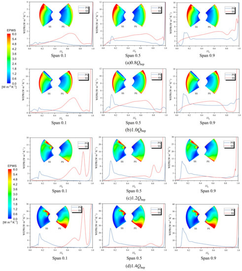 The entropy production by wall shear in the whole passage of the axial-flow PAT occupies a considerable part of the entropy production proportion (Figure 9). The impeller is the most important part of the axial-flow PAT, so it is important to clarify the distribution of entropy production rate induced by wall shear (EPWS) of the impeller to understand the mechanism of energy dissipation in the impeller. Figure 11 reflects the parameters of single blade, l0 is the chord length of the blade, and l/l0 represents the relative chord length position. Figure 12 displays the distribution of EPWS with different spans at four typical flow conditions. At different flow rates, the EPWS of impeller blade is much larger near 0.9 span, indicating that the wall shear stress and velocity are much larger near the impeller shroud. The wall friction loss of fluid and impeller blades is mainly concentrated on the tip clearance. The EPWS of blade pressure surface (PS) increases with the increase in l/l0 at different flow rates and spans, reaching a peak value near l/l0 = 0.12. The EPWS of the blade suction surface (SS) generally shows a trend of gradually increasing as the l/l0 rises. However, there is a steep increase in EPWS on the blade pressure surface near l/l0 = 0.90, which is related to the flow impact on the blade inlet. At low flow condition (0.8Qbep), the high EPWS region locates in the blade leading edge. The EPWS of the blade suction surface is significantly larger than the pressure surface, as the local low pressure near the suction surface can easily cause the unsteady flow regime and the occurrence of backflow phenomenon as well as the greater energy dissipation. At high flow conditions (1.2Qbep, 1.4Qbep), the high EPWS region on the suction surface shrinks significantly and moves to the blade leading edge, in contrast, the high EPWS region on the pressure surface becomes larger and moves to the trailing edge.