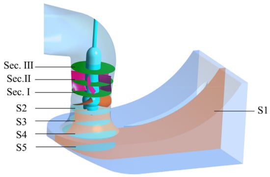 Figure 13 shows the schematic diagram of cross sections in the guide vane and dustpan-shaped conduit. The guide vane plays a role in smoothing the flow pattern of fluid entering the impeller domain when the axial-flow PAT in a turbine mode. Sec. I, Sec. II and Sec. III are located in the inlet, middle and outlet sections of the guide vane, respectively. Section S1 is the symmetric plane of the dustpan-shaped conduit, and the vertical distances between sections S2, S3, S4 and S5 and the impeller center are 0.2 D, 0.5 D, 0.8 D and 1.1 D, respectively (D is the impeller diameter).