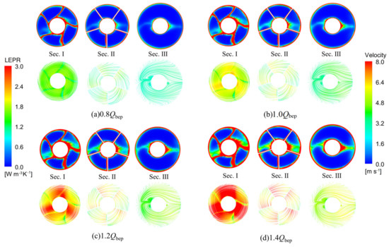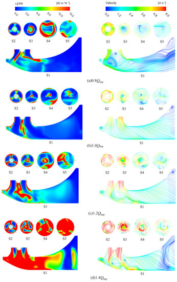The proportion of entropy production in dustpan-shaped conduit to entropy production of whole passage varies from 24.2% to 60.4% at different flow rates (Figure 8). The entropy production proportion of the dustpan-shaped conduit is very sensitive to the variation of the flow rate, and the proportion is the smallest at 1.0Qbep with the value of 24.2%, while reaching 60.4% at 1.4Qbep. In order to investigate the energy dissipation mechanism in the dustpan-shaped conduit, five typical cross sections were set up in the in dustpan-shaped conduit, as shown in Figure 11. The fluid flows out from the impeller, it still has a large kinetic energy, and the flow velocity gradually decreases and the pressure gradually increases in the dustpan-shaped conduit. The dustpan-shaped conduit plays the role of recovering part of the kinetic energy. Under the condition of 0.8Qbep, the LEPR area of each section is small while the LEPR area increases significantly along with the rising of flow rate. Combining with the streamline diagram of each section, it can be found that the greater the flow rate, the higher of velocity and the more chaotic the flow pattern. In Figure 15, there is a significant high LEPR region near the dustpan-shaped conduit center (sections S2, S3, S4 and S5), and the high LEPR region develops obliquely from the guide cap along with the flow direction to outlet. In addition, the twisted streamline of section S1 near the center of the dustpan-shaped conduit (Figure 15c,d) indicates the presence of an obvious spiral vortex zone, which is associated with the rotation of the impeller and the downward flow trend. It is clear that with the flow rate going up, the flow velocity and vortex intensity at the dustpan-shaped conduit inlet increase significantly, leading to an increase in the turbulence of the flow pattern. Consequently, a surge of LEPR in the dustpan-shaped conduit appears at high flow rates. Chaotic flow patterns and vortices are the essential sources of entropy production and hydraulic losses of the dustpan-shaped conduit.