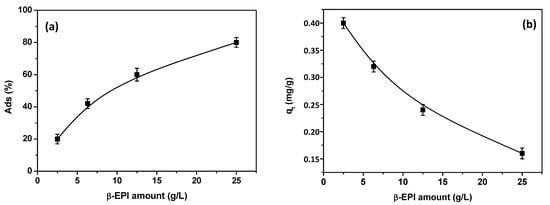 To confirm the key role exerted by β-EPI active sites on CBZ adsorption, in-batch experiments were performed using different polymer doses, i.e., 2.5, 6.3, 12.5, and 25 g/L. Figure 2a shows the dependence of the CBZ adsorption % at the equilibrium as a function of the polymer dose. From the results obtained, it is evident that when using higher amounts of the adsorbent, the CBZ retention increases dramatically.