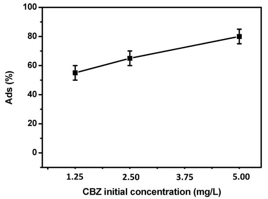 At higher CBZ concentrations, the adsorption efficiency increases, as shown in Figure 3, which was already observed when studying the adsorption of sulfamethoxazole [23] and contrary to what was obtained in the case of atrazine [19]. This trend suggests that the CBZ gradient of concentration between the aqueous phase and the solid one is the driving force for the adsorption process and overcomes the resistance to mass transfer between the two phases; the higher the gradient, the more favored the process [27].