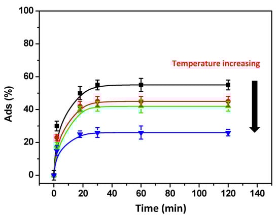 These results suggest that the process under exam is exothermic, i.e., thermodynamically favored at lower temperatures. From the kinetic point of view, the process is faster at high temperatures because of the increased molecular agitation favoring the collision between the adsorbate and the adsorbent. For this reason, the % adsorption curves in the first 15 min increase and reach the plateau more rapidly following the order 293 K < 303 K < 323 K < 343 K.