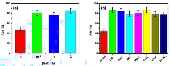 Further experiments were performed with other types of inorganic salts to verify the effect of different anions and cations present in water on CBZ adsorption onto β-EPI. For this purpose, 5 mg/L CBZ aqueous solutions containing 2 M LiCl, NaCl, KCl, MgCl2, CaCl2, NaBr, and NaClO4 were used. Results, depicted in Figure 5b, indicate that no significant changes in the adsorption efficiency were observed by changing the type of ion; the same occurs by increasing the ionic strength of the medium, i.e., switching to divalent cations. These trends suggest that the process considered is not ruled by electrostatic interactions, as already observed by Zhou using another cyclodextrin polymer [24].