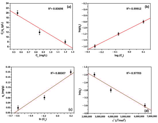 Adsorption isotherms at 298 K: (a) Langmuir, (b) Freundlich, (c) Temkin, and (d) Dubinin–Radushkevich models.