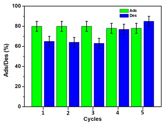 As can be observed in Figure 7, CBZ desorption efficiencies (blue bars) ranged from 67 to 92%; moreover, the system studied did not undergo significant changes in the adsorption efficiencies (green bars) when recycled five times, providing in all cases about 80% of CBZ removal from water. Thus, the potential of this polymer is very promising for real applications in water treatment, with a consequent reduction in costs and energy, along with the possibility of recovering both the adsorbent and the pollutants.