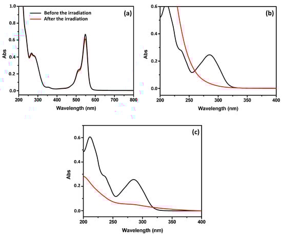 CBZ spectra before and after 1 h-long UV irradiation at 254 nm in the presence of (a) 10−5 M Rose Bengal, (b) 10−2 M hydrogen peroxide, and (c) 0.67 g/L of titanium dioxide.