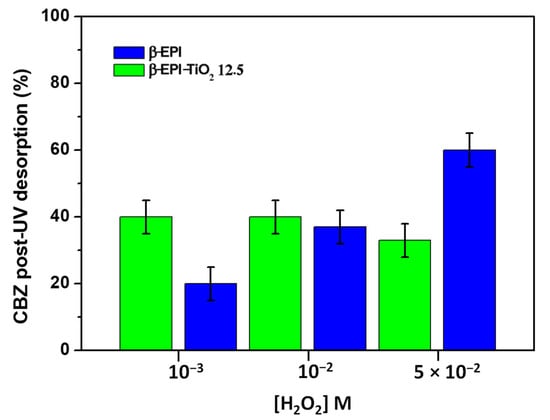 The use of hydrogen peroxide for a possible enhancement of photodegradation of the CBZ adsorbed was investigated, using both β-EPI and β-EPI TiO2 12.5 polymers. The polymer irradiation steps with UV light were performed using H2O2 solutions at different concentrations: 10−3, 10−2, and 5 × 10−2 M. The percentages of CBZ desorption from both β-EPI and β-EPI TiO2, after UV treatment, were compared. In the absence of TiO2 (Figure 9, blue bars), a slight decrease in CBZ desorption can be observed at higher H2O2 concentrations, which means that the AOP efficiency results enhanced. This can be due to the increment of OH radicals generated in solution under UV light in the presence of a higher number of hydrogen peroxide molecules, which promote the oxidation of CBZ.