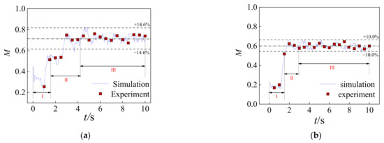 Comparison of the Lacey mixing index between experiment and simulation. (a) Ellipsoidal drum; (b) circular drum.