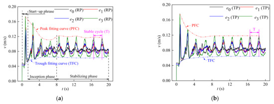 To explore the speed fluctuation range and fluctuation characteristics of special-shaped particles at different eccentricities, the different eccentricities of rectangular flake particles at the speed of 15 rpm are taken as an example. The analysis of Figure 5 shows that the average speed and periodic change of particles at 15 rpm are shown in Table 4. The eccentricity has little effect on the period of the average speed of overall special-shaped particles, and its fluctuation range is no more than 8.96% of the periodic mean value. However, with the increase of the eccentricity of the rotating device, the average velocity fluctuation range of the overall special-shaped particles increases. Taking the fluctuation range of the wave crest fitting curve in the stabilizing stage of e0 and e3 as an example, the average value of the wave crest under the e3 working condition is 2.28 times that of e0. This is because with the increase of eccentricity, the length difference between the major and minor axes of the elliptical rotary device increases. Compared with the circular drum (diameter = 84 mm), the particles at both ends of the major axis of the elliptical drum (a = 94 mm) have a higher linear velocity at the same angular velocity. At the same time, the trajectory of particles becomes longer, resulting in drastic changes in the speed of particles. Affected by the rotation cycle of the drum, this change is most obvious at 1/4 T and 3/4 T (peak and trough).