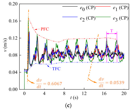By comparing (c) in Figure 5, Figure 6 and Figure 8, with the continuous rotation of the drum, the velocity period and amplitude of the particle system become gradually stable. Taking Figure 8c as an example, in the start-up phase of 0.52–0.72 s, the average velocity change rate is 0.3667, while in the stabilizing phase of 11.67–12.50 s, the average particle velocity change rate is only 0.0362. Influenced by the start-up phase, the average speed change rate at the initial stage is about 10 times (at 15 RPM) or even 20 times (at 45 RPM) of that at the stable stage. By longitudinal comparison of the average speed change rate at the starting stage (Figure 5 and Figure 6), it is not difficult to see that the change in speed has no great influence on the speed change rate at the starting stage. The average speed change rate at 45 rpm is only 0.2278 (0.37 times) larger than that at 15 rpm.