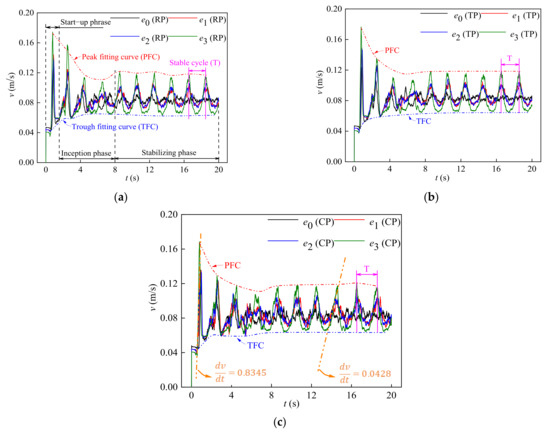 By fitting the average velocity peak of particles under various working conditions in Figure 6, the average velocity peak fitting curve (PFC) of particles under different working conditions at 45 rpm is obtained, as shown in Figure 7. The effects of different roundnesses of particles on the fluctuation period and amplitude (A) of PFC are analyzed.