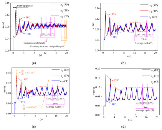 In the circular drum with eccentricity e1 and e2, the PFC has almost no fluctuation after 4 s. In the drum with an eccentricity of e3, PFC has been in a cycle decreasing fluctuation process since 9.12 s, which is quite different from (a) in Figure 9. The PFC of the former decreases gradually after the change of cycle (fluctuation cycle of PFC), while the PFC of the latter fluctuates little with the change of cycle (fluctuation cycle of particle average velocity change), and the concepts of the two cycles are not the same, therefore, it has no comparative significance.