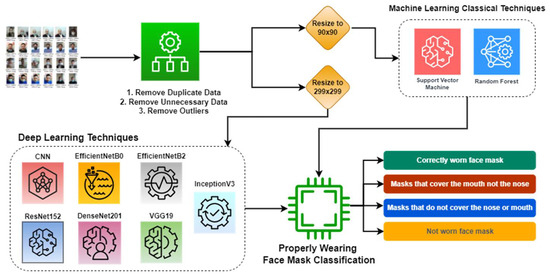 - Tomás, J.; Rego, A.; Viciano-Tudela, S.; Lloret, J. Incorrect Facemask-Wearing Detection Using Convolutional Neural Networks with Transfer Learning. Healthcare 2021, 9, 1050. [Google Scholar] [CrossRef]