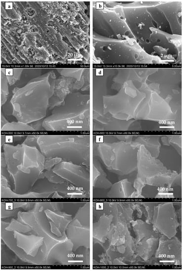 Scanning electron microscopy images of (a,b) char carbonized at 900 °C and ACs after activation at (c) 500 °C, (d) 600 °C, (e) 700 °C, (f) 800 °C, (g) 900 °C and (h) 1000 °C.