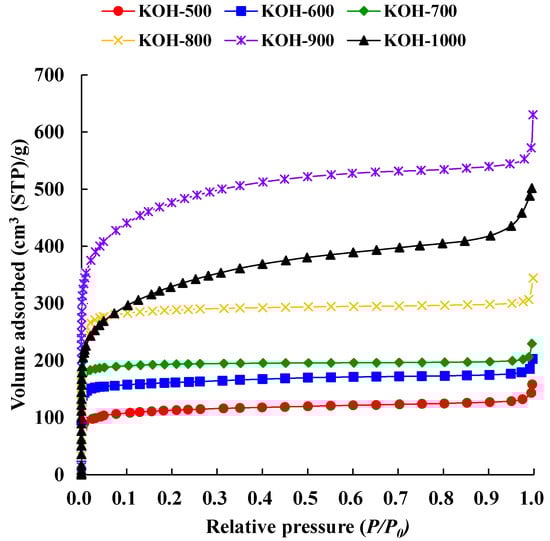 The N2 adsorption isotherms of ACs prepared at different activation temperatures are shown in Figure 2. According to IUPAC classification, ACs synthesized at 500 to 800 °C exhibited conventional type I(a) adsorption isotherms (known as Langmuir) [], indicating the presence of micropores [], whereas at 900 and 1000 °C, a typical type I(b) isotherm was observed, revealing mesoporous structure at KOH-900 and KOH-1000 []. N2 adsorption increased gradually from 500 to 700 °C, then sharply at 800 and 900 °C. It was also observed that adsorption at low relative pressure increased remarkably as a vertical straight line, suggesting that microporous structure was well developed at 800 to 900 °C in ACs beneath high activation temperature. On the other hand, when the temperature reached 1000 °C, the amount of nitrogen adsorbed was reduced, virtually matching the temperature of 800 °C, implying that the BET surface area (SBET) was nearly identical to KOH-800.