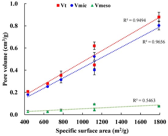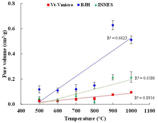 For the mesopore volume (Vmeso) of ACs estimation, three methods were applied as Vt-Vmic, the BJH method and the INNES method mentioned in Section 2.3. The calculated results and coefficient of determination of each method are shown in Figure S2 and Figure 4. All ACs presented clearly dominant microporosity based on Table 2 (Vmic/Vt = 84–91%) and N2 adsorption isotherms, which demonstrated that both the BJH method (R2 = 0.6623) and the INNES method (R2 = 0.6186) are inappropriate to determine Vmeso in this study. On the contrary, Vt-Vmic showed a higher R2 value, while Vmeso gradually increased with rising temperature and coincided with the N2 adsorption at P/P0 = 0.2~0.9.