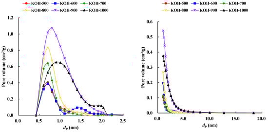 Pore-size distribution (PSD) is also a crucial factor of ACs characteristics since it could affect the adsorption performance as an adsorbent or the efficiency of ionic transportation as a supercapacitor in most industrial applications. In general, effective ion–pore matching contributes to complete exploitation of the pores to develop the double layer structure, which is beneficial to better capacitance. To efficiently host the electrolyte ions in microporous or mesoporous carbon materials, it is necessary to develop pore size more precisely []. The PSD of ACs is shown in Figure 5 using the MP method and the BJH method, respectively. It was observed that the micropores of the ACs prepared at 500–800 °C were mostly distributed in the range of 0.4–1.7 nm. A significantly higher number of large micropores (1.4–2.0 nm) with diameters ranging from 0.4 to 2.0 nm were found at KOH-900 and KOH-1000 than at others. Since this range of pore size is larger than the size of the adsorbent nitrogen molecules, it is easier for nitrogen molecules to be adsorbed, which contributes to the high specific surface area. On the other hand, the mesopores were calculated to be distributed between 2 and 6 nm in KOH-900 and KOH-1000, which could be explained by the shape of the N2 adsorption isotherms.