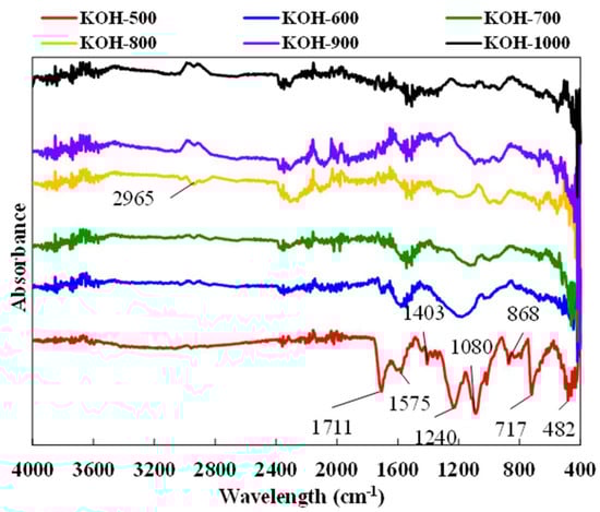The functional groups on the ACs surface were determined by FTIR spectrometry and are shown in Figure 6. Compared to others, KOH-500 showed several strong adsorption peaks at different wavelengths, indicating more functional groups on the surface of ACs. The bands located at 482 cm−1, 717 cm−1 and 868 cm−1 correspond to the C-H stretching vibration of aliphatic and/or aromatic groups []. The strong adsorption peaks observed at 1080 cm−1 and 1240 cm−1 were ascribable to the C–O–C stretching vibration of alcohols, ethers, phenols or O–H bending vibration [,]. The bands at 1575 cm−1 are usually related to C=O, C–O (carboxyl, aldehyde, amide bond) and/or C=C (alkene) stretching vibration, while the band at 1711 cm−1 can be attributed to C=O [,]. All spectra of oxygen-containing functional groups showed a decreased trend and widened with increasing activation temperature, demonstrating that alcohols, ethers, phenols and carboxylic acid decomposed at higher temperatures. On the other hand, the new band located at 2965 cm−1 from 800–1000 °C was related to C–H vibration. This revealed that the contents of aliphatic structures increased with increasing activation temperature, while oxygen-containing structures such as -OCH3- dissociated under higher temperatures [,,].