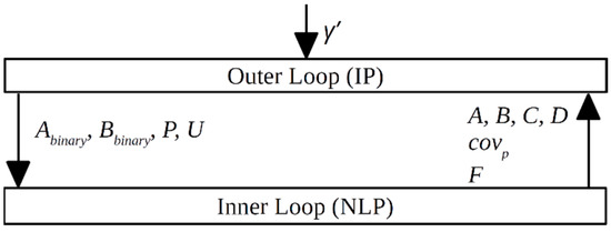 As mentioned earlier, an adaptive algorithm is selected and the main aim is to divide the original problem into two parts. Accordingly, the solution is obtained through a hierarchical decomposition of binary and continuous decision variables, as outer and inner loops similar to [45,46,47]. Accordingly, the outer loop optimization is an integer programming problem (IP) determining existence of the neurons (P), connections (ABinary, BBinary), and selection of input variables (U). After the outer loop is utilized, the inner loop will decide on the optimal weight values for a fixed neural network topology at the current iteration. This decomposition allows faster and effective solution of the original method albeit global optimal cannot be guaranteed.