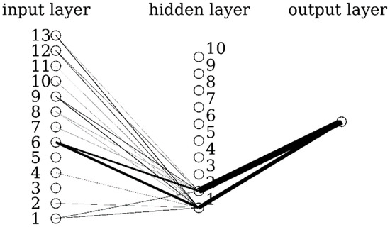 As shown in Figure 5, in this particular case, 5 neurons (out of 15) are selected. Similar to first case study, the connection line widths are scaled by the absolute values of the corresponding weight.