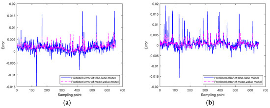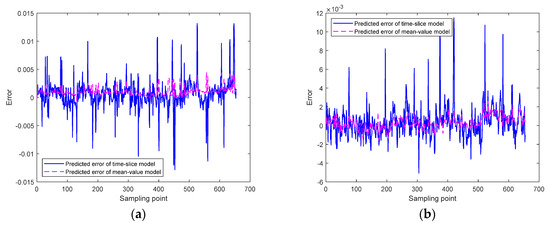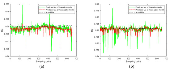 Next, Modes 1 and 2 are combined for modeling and predictions to find out whether the two modes show significant differences. Using training data 1 and 2, the regression parameters of the time-slice and mean-value models are obtained successively. Then, the Mach numbers are predicted for test data 1 and 2; the predicted results are shown in Figure 4a,b. Similarly, the mean-value model yields better prediction results than the time-slice model. The prediction errors of both models are shown in Figure 5a,b for test data 1 and 2. Once again, the superiority of the mean-value model is clearly visible.