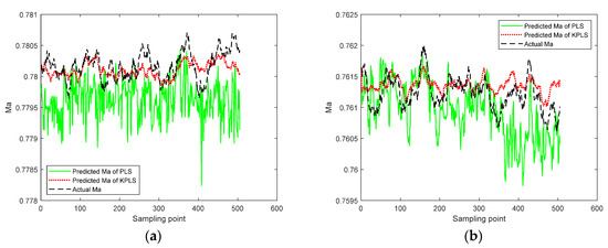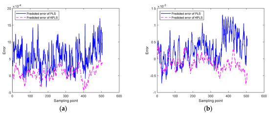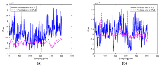 Firstly, the prediction results of mode 1 are obtained. Training data 1 and the first 150 sample points of test data 1 are used as the training data, and the mean-value KPLS model is established. The rest data of test data 1 are used as the test data. Figure 6a shows the predicted results of the mean-value KPLS model which are compared with those of mean-value PLS model. It can be seen that the mean-value KPLS model has better prediction results. Similarly, the prediction results of mode 2 are obtained. And the predicted results are presented in Figure 6b. The same conclusion can be drawn that the mean-value KPLS model has better prediction results. Besides, the prediction errors of both the mean-value PLS model and the mean-value KPLS model have been shown in Figure 7a,b for mode 1 and 2, respectively, and the superiority of the mean-value KPLS model is clearly represented.
