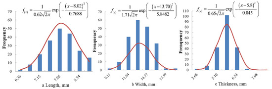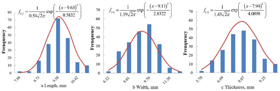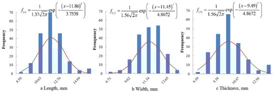 The results showed that the sizes all followed a normal distribution. The distributions of the tri-axial dimensions are shown in Figure 2, Figure 3 and Figure 4.