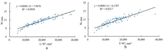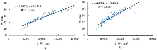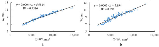 Relationships between two dimensions of Jinong 2 seeds: (a) width–length and (b) width–thickness.