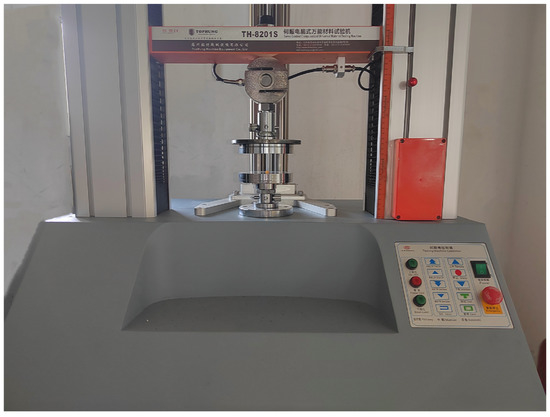The mechanical properties of the three varieties of Cyperus esculentus seeds were measured and analyzed. The elastic modulus is a measurement of a material’s resistance to elastic deformation [18]. In this paper, the elastic modulus of the Cyperus esculentus seeds was measured by a compression test using a universal testing machine, as shown in Figure 8. The curvature radius between the seed–upper contact surface and the seed–lower contact surface was considered to be the same, and the elastic modulus was calculated according to the simplified Hertz formula in Equation (1):