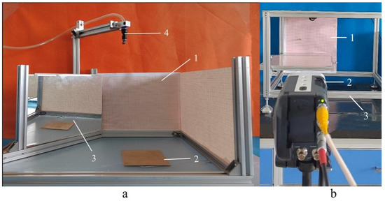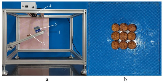 (a,b) Static friction coefficient measurement tests: (a) Measurement device: 1—inclinometer, 2—angle transducer, 3—seed plate, 4—electromotor; (b) Seed plate.