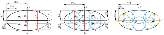 The filing method for the 7-sphere model of Jinong 1 was as follows: the length (L), width (W), and thickness (T) of the seed were aligned on the major axis (axis x), the middle axis (axis z), and the minor axis (axis y) of the ellipsoid, respectively. On the xoy plane, first, the maximum sphere (sphere O1) with a radius of T/2 was filled at the center (point O1) of the ellipsoid, as shown in Figure 11a. Second, on the xoz plane, the width W of the ellipsoid was divided into trisections, and two line segments, and , which were parallel to axis x and intersecting with the ellipsoid outline, were made through each equal diversion point. Then, the parallel line segments and were divided into trisections, as shown in Figure 11b. The equal diversion points (point O2, point O3, point O4, point O5, and point O6) were the centers of the new filing spheres. Thus, another five spheres that were tangential to the outline of the ellipsoid were filled, defined as sphere O2, sphere O3, sphere O4, sphere O5, and sphere O6, as shown in Figure 11c. Finally, the last sphere O7 was filled at the position of the hilum. As a result, seven total spheres were filled. Based on the filing principle, the 7-sphere, 9-sphere, and 11-sphere models of Jinong 1 were successively modeled, as shown in Figure 14a–c.