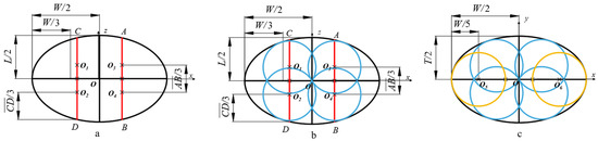 The filing method for the 7-sphere model of Jinong 3 was as follows: the width (W), length (L), and thickness (T) of the seed were aligned on the major axis (axis x), the middle axis (axis z), and the minor axis (axis y) of the ellipsoid, respectively. On the xoz plane, first, the width W of the ellipsoid was divided into trisections, and two line segments and , which were parallel to axis z and intersecting with the ellipsoid outline, were made through the diversion points. Then, the parallel line segments and were divided into trisections, as shown in Figure 13a. Moreover, the equal diversion points (point O1, point O2, point O3, and point O4) were the centers of the new filing spheres. Thus, four spheres that were tangential to the outline of the ellipsoid were filled, defined as sphere O1, sphere O2, sphere O3, and sphere O4, as shown in Figure 13b.