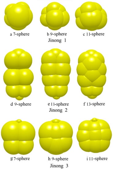 In addition, on the xoy plane, the width W of the ellipsoid was divided into five parts, and the equal diversion points (point O5 and point O6) were only considered as the centers of the new filing spheres. Thus, another two spheres that were tangential to the outline of the ellipsoid were filled, defined as sphere O5 and sphere O6, as shown in Figure 13c. Finally, the last sphere O7 was filled at the position of the hilum. As a result, seven total spheres were filled. Based on the filing principle, 7-sphere, 9-sphere, and 11-sphere models of Jinong 3 were successively modeled, as shown in Figure 14g–i.