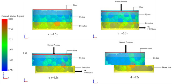 When the processes of the direct shear test were simulated, the Hertz–Mindlin (no-slip) contact model was used, and the EDEM version was EDEM 2018, DEM Solutions, Edinburgh, UK, 2002. To ensure the convergence and stability of the numerical calculation in the simulation, the time step in the simulations was 5 × 10−7 s. The simulation time was 12 s. The Cyperus esculentus seed particles were generated by a normal distribution in terms of volume, and the sample mass generated was the same as the test mass for each case. At 2 s in the simulation, the plate was subjected to a normal force of 200 kPa in the +z direction and was stabilized for 0.5 s; at 2.5 s in the simulation, the down box started to move at a speed of 0.002 m/s in the +x direction until the end of the simulation, and the screenshots of the simulation for different times are shown in Figure 17a–d.