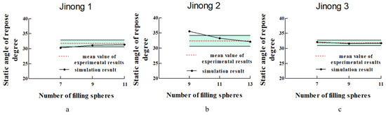 - The piling tests and the bulk density test were both adopted for further modeling verification. With the increase in the number of filing spheres, the simulated results were consistent with those obtained experimentally in the piling test and the bulk density test. Except for the 7-sphere of Jinong 1 and 9-sphere of Jinong 2 in the piling test, and the 9-sphere of Jinong 2 in the bulk density test, the mean value of the simulated results fluctuated within the standard deviation of the experimental results. The mean values of the simulated results were all within the margin of the standard errors of the experimental results. Thus, the feasibility and rationality of the Cyperus esculentus seed models established and the parameters’ selection in this paper were further verified;