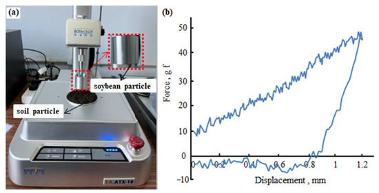 A texture test was used to verify the applicability of the model, and the test device is shown in Figure 1a. Taking JD17 as an example, the test procedure was as follows. The soil tray was placed and the soybean particle fixed under the probe, then the texture analyzer was calibrated. The probe was moved downwards after starting the texture analyzer. After the soybean particle made contact with the soil, the force on the probe gradually increased. When the force reached its maximum, the moving probe started to move in the opposite direction until it stopped.