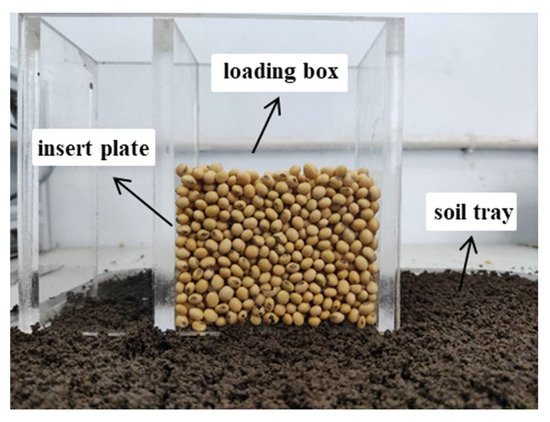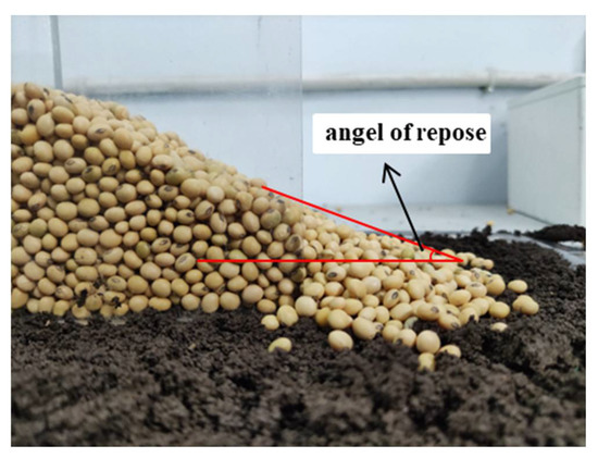 The piling test apparatus was mainly composed of soil tray, loading box and insert plate, as shown in Figure 2. The test procedure was as follows. The test soil was configured and its moisture content was measured at 24.32%. The moisture content of the soil was kept constant during the test. The soil was loaded into the soil tray. Soybean particles were loaded into the loading box. Once the soybean particles had stabled, the insert plates were pulled out. The soybean seed particles flowed out of the loading box and formed an angle of repose, as shown in Figure 3. The angles of repose were processed using image processing software and three replicate trials were carried out for each variety. The angle of repose of the soybean seed particles were 19.79°, 20.32° and 20.96° for SN42, JD7 and ZD39, respectively.