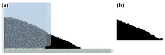 A screenshot of the simulation results is shown in Figure 4a. The part of the soy bean that flowed out of the loading box in contact with the soil was used as the study object to analyze the angle of repose results, as shown in Figure 4b.