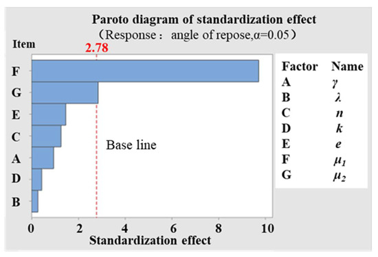 The results of the PB test were analyzed by Analysis of variance (ANOVA), as shown in Table 3. The linear model had a p-value of 0.01, which showed a significant performance. For the different factors, the p-value of the coefficient of static friction was 0.001, indicating that it was extremely significant for the response index. The p-value of the coefficient of rolling friction was 0.046, indicating that it was significant for the response index. The p-values for the other parameters were much greater than 0.05 and were insignificant for the response index. The same conclusion could be drawn from the Pareto diagram of the standardization effect, as shown in Figure 5. Accordingly, the sensitive parameters were determined as the coefficient of static friction and the coefficient of rolling friction.