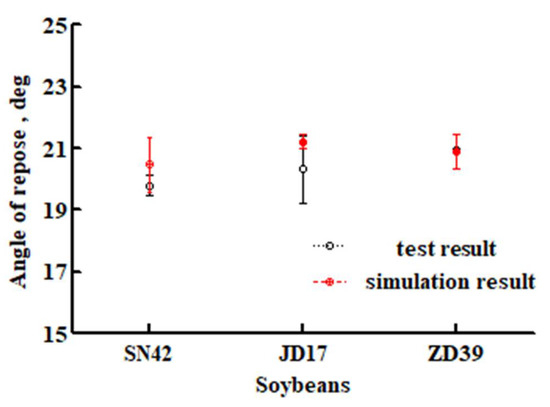 A CCD test was performed to calibrate the static and rolling friction coefficients for each variety of soybean seed particles, as shown in Table 4. The other parameters took the system default values.