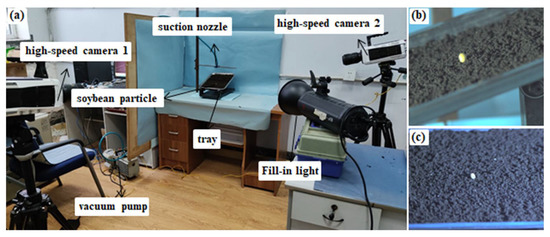 The process of collision between soybean seed particles and soil particles during the seed throwing test was very transitory. The bouncing and rolling of the soybean could not be observed by the eye. In this paper, Xu’s test setup [10] was improved. Two high-speed cameras were used, which were placed vertically, as shown in Figure 7a. The motion of the soybean seed particles could be captured in both the normal and tangential directions at the same time, as shown in Figure 7b,c.