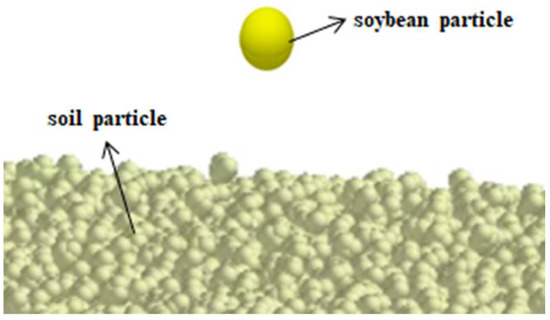 There is always a collision between the soybean seed particles and the soil particles during seed throwing. An accurate analysis of the influence of different factors on the bouncing distance (the maximum height reached by the seed after the first bounce) and rolling distance (the maximum distance measured from the point of impact) of soybean seed particles is essential. Bufton et al. [1] described the trajectory of different seeds after release from the metering mechanism through experimental tests. The seeds were made to impact the soil surface at a known impact velocity and angle so as to measure the amount of bouncing and rolling distance that occurred after the bounce. The test results showed that impact velocity and angle, soil surface properties and seed type all influenced the mean displacement and displacement variation. Ma Xu [2] used photoelectric sensors to determine the seed landing speed and measured the bouncing and rolling distance of the seeds after landing in the seed groove. A mathematical model of the bounce and roll distance after seed bounce was further developed. A computer simulation was carried out by applying the mathematical model. The accuracy of the mathematical model was proved by comparing the simulation and test results. However, researchers have mainly used experimental methods to study the position of seeds after throwing and have tested fewer factors. Nowadays, the DEM is widely used in the field of agricultural engineering [3,4,5,6,7,8]. Therefore, the DEM can be combined with the test method to analyze in depth the influence of different factors on the bouncing and rolling distance of soybean seeds.