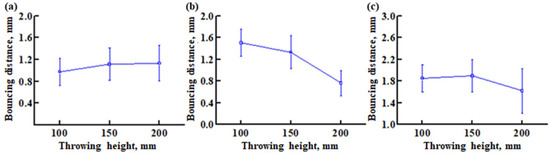 The relationship between bounce distance and throwing height for (a) SN42 (b) JD17 and (c) ZD39.