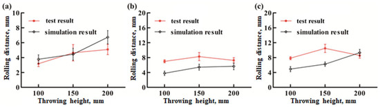 Figure 10 shows the relationship between rolling distance and throwing height for the three varieties. For SN42, the rolling distance gradually increased when the throwing height varied from 100–200 mm, as shown in Figure 10a. For JD17 and ZD39, the test results showed that the rolling distance of soybean did not vary much when the throwing height varied, and the largest difference between the simulation and test results for JD17 was 4.23 mm at a throwing height of 100 mm. The largest difference between the simulation and test results for ZD39 was 4.23 mm at a throwing height of 150 mm, as shown in Figure 10a,b.