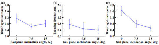 Figure 11 is the relationship between bounce distance and soil plane inclination angle for the three varieties. For SN42, the bounce distance of soybean seed particles tended to decrease and then increase as the inclination of the soil plane increased, but the overall bounce distance was not significant. For JD17 and ZD39, the bounce distance gradually decreased as the inclination angle of the soil plane increased. At an inclination angle of 0°, the three soybean seed particles had the largest bounce distances, with values of 1.13 mm, 0.76 mm and 1.62 mm, respectively, as shown in Figure 11.