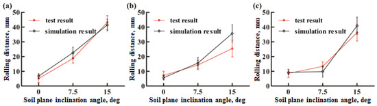 Figure 12 shows the relationship between rolling distance and soil plane inclination angle for the three varieties. From the test results, it can be seen that as the soil plane inclination angle increased, the rolling distance of soybean seed particles became larger. The rolling distances were smallest at 0°, with values of 5.09 mm, 6.25 mm and 8.55 mm, and largest at 15°, with values of 43.16 mm, 25.41 mm and 36.2 mm, respectively. At the same time, the simulation and test results were not very different and had the same trends.