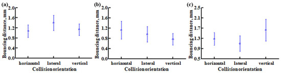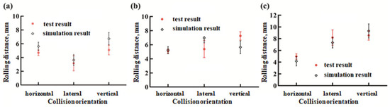 For JD17, as shown in Figure 15b, the test results showed that the rolling distance was the smallest in the horizontal collision and the largest in the vertical collision, with a difference of 2.16 mm. The difference between the simulation and test results was not significant, with the largest difference being 1.61 mm for the vertical collision.