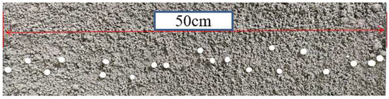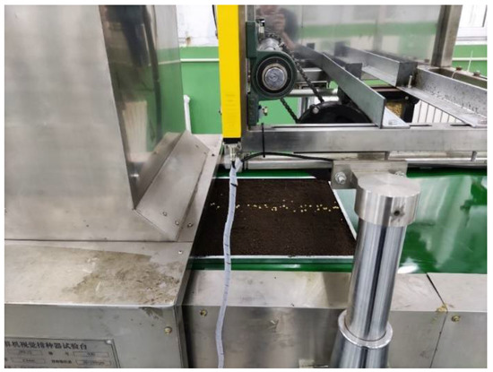 Using the SN42 as an example, the test procedure was as follows: The seeding test bench was turned on, The seeder speed was adjusted to 20 r/min and the seedbed belt speed was adjusted to 0.5 m/s. The soil tray was released from the start of the seed bed belt and the power turned off after completing seed throwing. A camera was used to photograph the distribution of soybean seed particles on the soil tray, as shown in Figure 17.
