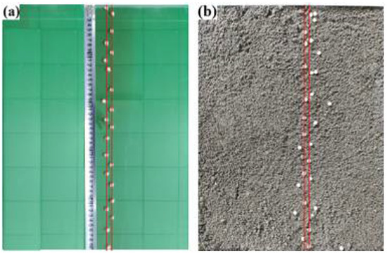 As a comparison, soybean seeds were thrown directly onto the seedbed belt. Figure 18 shows the distribution of soybean seed particles when seeds were thrown on the seedbed belt and soil tray. In Figure 18a,b there are two red lines, which indicate the line where the soybean seed particles would be if they were not bouncing and rolling.