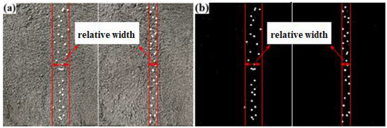 The effect of relative seed throwing speed on seed bouncing and rolling was studied by analyzing the relative width of the distribution of soybean seed particles on the soil tray. To ascertain the distribution of soybean seeds on the soil surface, the two outermost soybean seed particles were found and taken as the reference point. Two straight lines were made along the direction of movement of the soil tray, and the horizontal distance between the two lines was the relative width. The relative widths of the distributions of soybean seed particles at different relative seed throwing speeds are shown in Figure 19a. In order to accurately analyze the relative width between soybean seed particles, the picture was first binarized using image processing software to obtain a binarized map of the seed distribution, as shown in Figure 19b. The relative width of the distribution of soybean seed particles on the seeded belt in the picture was calculated.